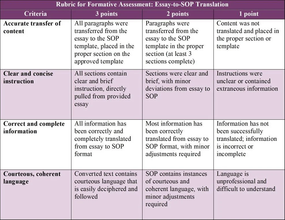 For one formative assessment, the students will work in pairs to assemble a pre-written document into a structured standard operating procedure (SOP). The students will receive a copy of a deconstructed SOP, written in an essay format. They will also receive an SOP template with only headings filled in. Together, the students will convert each paragraph of the essay into a cohesive standard operating procedure, ensuring all five sections (purpose, scope, roles and responsibilities, abbreviations and definitions, and procedure content) are present and complete. All information must be transferred from essay format to the standard operating procedure template. The instruction must clear, coherent, concise, concrete, correct, complete, and courteous.