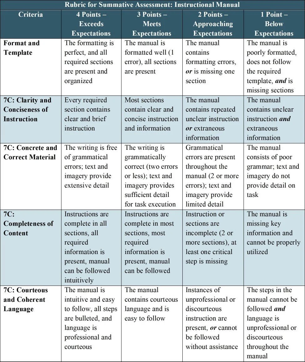 One summative assessment tasks the students with developing their own controlled document. Each student will select an object of their choosing from their home, classroom, or workspace. Using the provided template, each student will create an instructional manual for the object. At a minimum, the manual must include a diagram of the object, an explanation of its purpose, instructions on its use, and safety considerations. The manual must follow the Seven Cs of technical writing: clear, coherent, concise, concrete, correct, complete, and courteous.