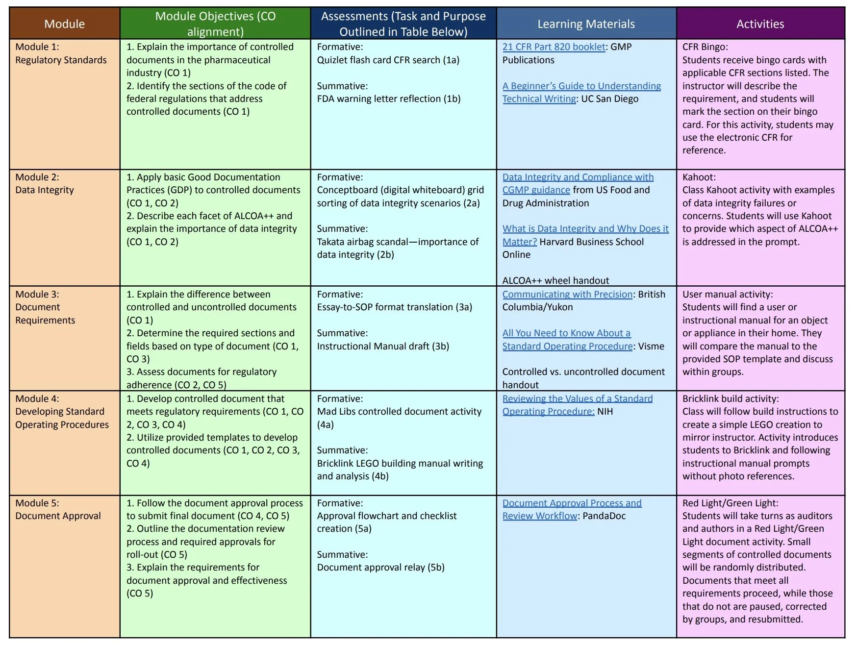 The purpose of this assessment is to evaluate the student’s ability to write a controlled document and follow technical requirements. Over the course of the module, students learned about SOP templates, the Seven Cs, data integrity, and Good Documentation Practices (GDP). This assessment aligns with: